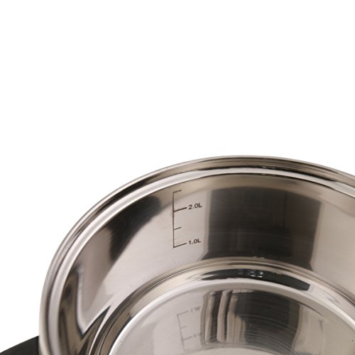 De kookpan van roestvrij staal en het deksel van de pan hebben kunststof handgrepen – eenvoudige bediening en bescherming tegen hitte ook bij het koken – de geïntegreerde literschaal geeft praktisch de vulhoogte van 2,5 liter aan