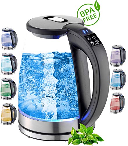 Specification: Waterkoker van glas en roestvrij staal, theekoker, inhoud 1,8 liter, 2200 watt, 100% BPA-vrij, warmhoudfunctie, ledverlichting met kleurverandering, met temperatuurkeuze, temperatuurinstelling van 40 °C tot 100 °C